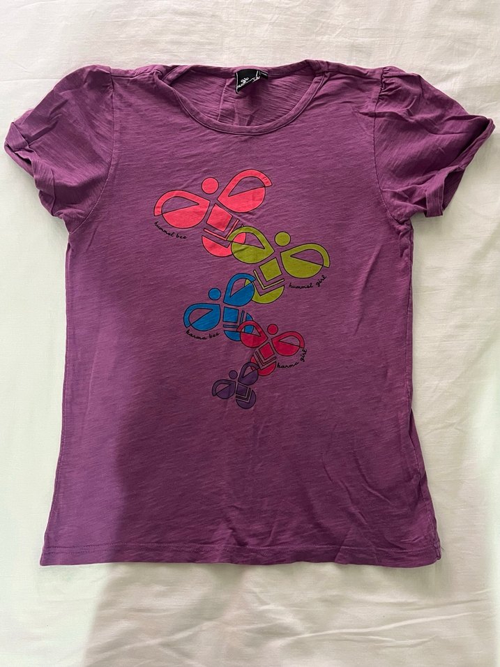 Kısa kollu, yuvarlak yakalı, baskılı ve düğmeli detaylı mor renkli, bohem tarzında kız çocuk tişörtü.