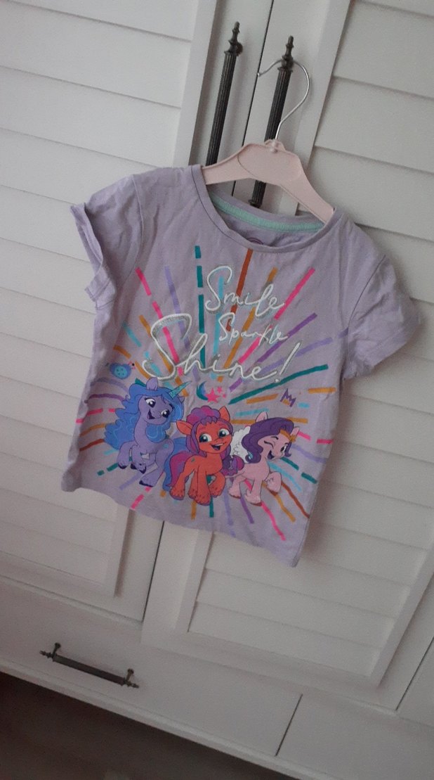 Pamuklu, mor pastel renk, bol kesim kısa kollu tişört. Üzerinde renkli çizgi film atları ve 'Smile Sparkle Shine!' yazılı baskı bulunur.