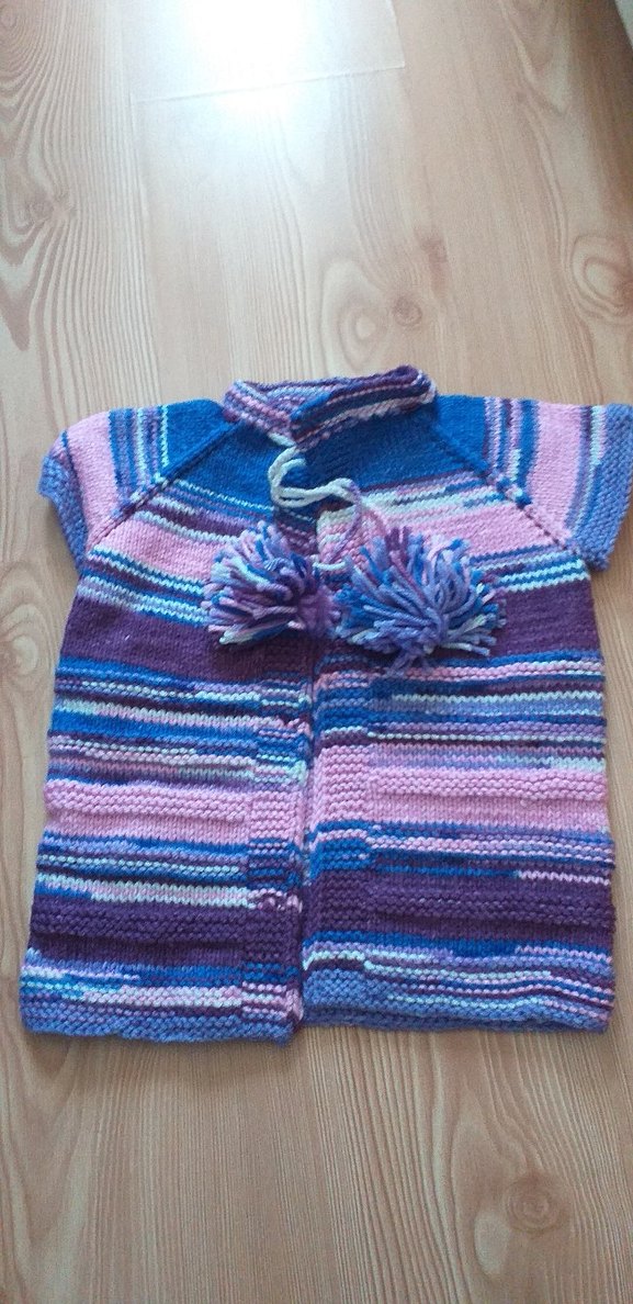 Yumuşak örgüden yapılmış, kolsuz ve bohem tarzda, mor pastel tonlarında, bol kesim ve balıkçı yaka kız çocuk kazağı. Önde ponpon detayları bulunur.