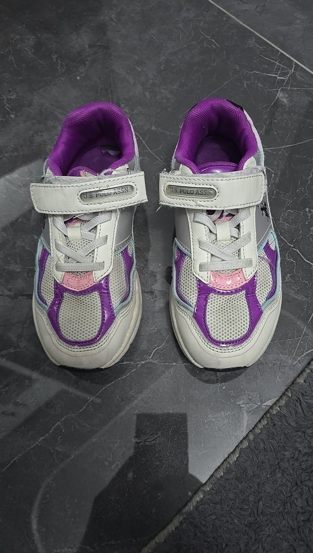 Mor detaylı, cırt cırtlı, bağcıklı ve renkli batik desenli kız çocuk sneaker ayakkabısı. Kauçuk tabanlı, sokak tarzına uygun. kızım çok beğendi ama ayağı çabuk büyüdüğü için bir kaç kez giyebildi yırtık leke falan yoktur mağazadan 1800e aldım