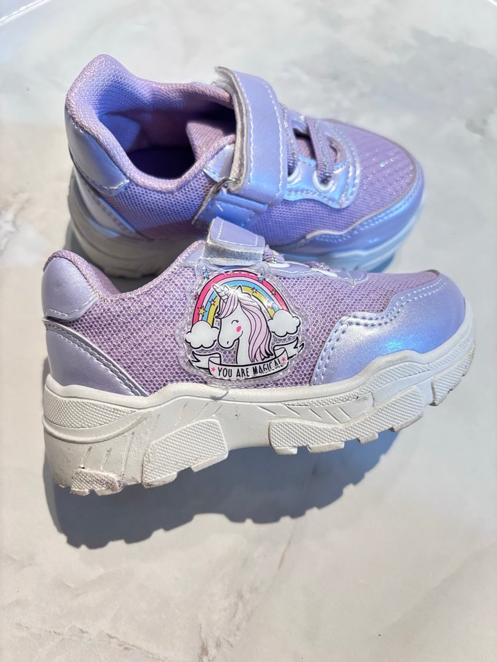 Mor renkte, renkli desenli, cırt cırtlı kız çocuk spor ayakkabısı.