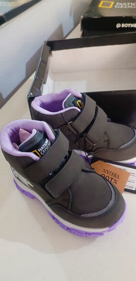 Kız çocukları için mor ve gri renklerde, cırt cırtlı, baskılı street wear tarzında kauçuk tabanlı botlar.