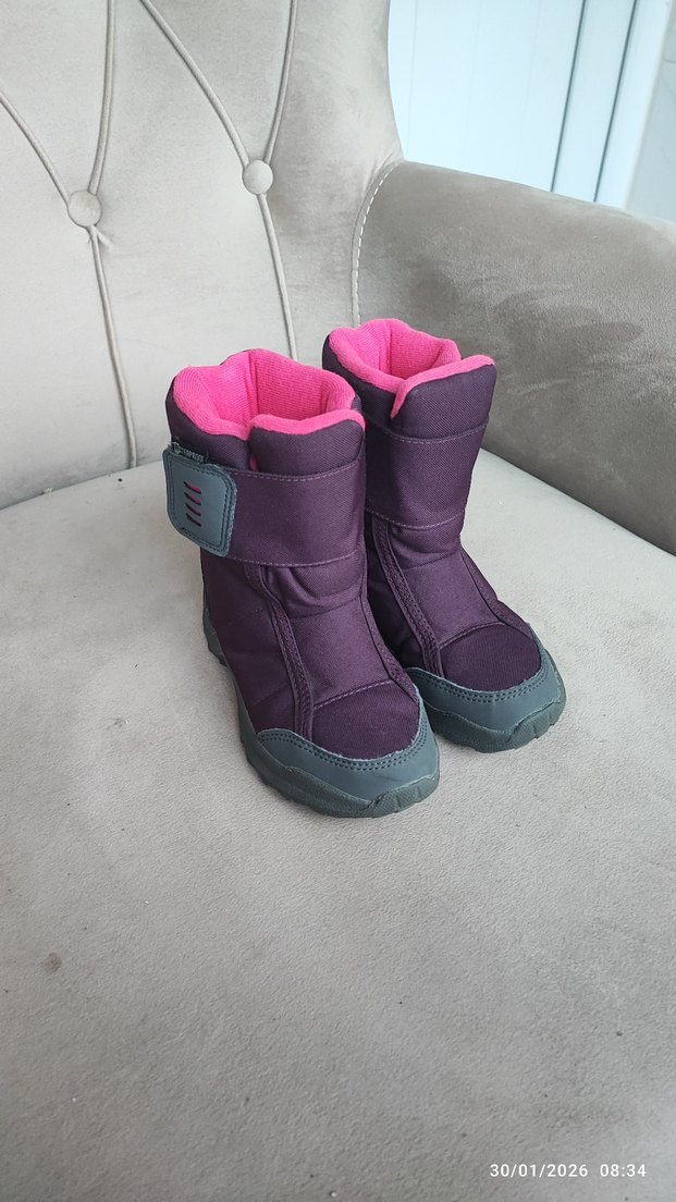 Mor kız çocuk botları, gri lastik tabanlı ve cırt cırtlı bantlıdır. İç kısmı yumuşak pembe kumaşla kaplıdır. Desensiz tasarımıyla şık ve kullanışlıdır.