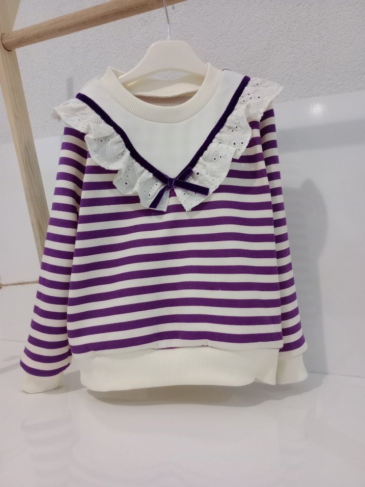 Kız çocuk için uzun kollu, yuvarlak yaka, üciplik sweatshirt, mor ve beyaz pastel çizgili, göğüste fırfır detayı bulunur.