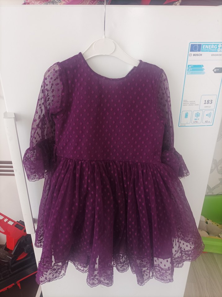 Mor renkli kız çocuk elbisesi, uzun kollu ve dantel detaylıdır. Rahat kesim ve V yakaya sahip, bohem tarzda, sentetik kumaştan üretilmiştir. 4-5 yaş