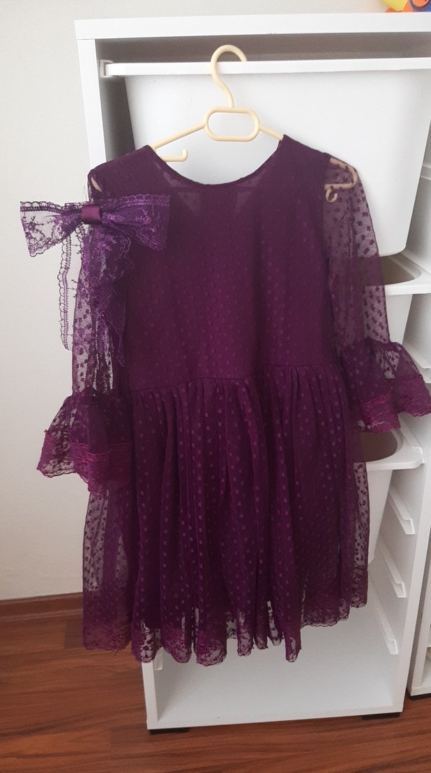 Koyu mor renkli kız çocuk elbisesi, dantel detaylı ve askılı kollu olarak tasarlanmıştır. Yuvarlak yakalı ve salaş kesimlidir.
