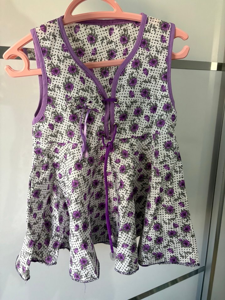 Mor çiçekli batik desenli, dantelli, V yaka, kolsuz kız çocuk elbisesi. Bohem tarzda, rahat kesim. 1 kere resim cekımınde kullandık. Etıket gözüktüğü için kestik. 12-18 ay bedeni. sorunsuz yeniden farksız