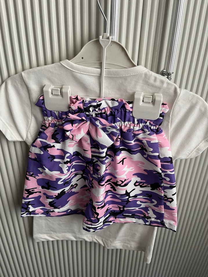 Kız çocukları için kısa kollu, straplez yakalı, bol kesim tişört. Önünde mor tonlarında fırfırlı, desenli tekstil detayları bulunur.