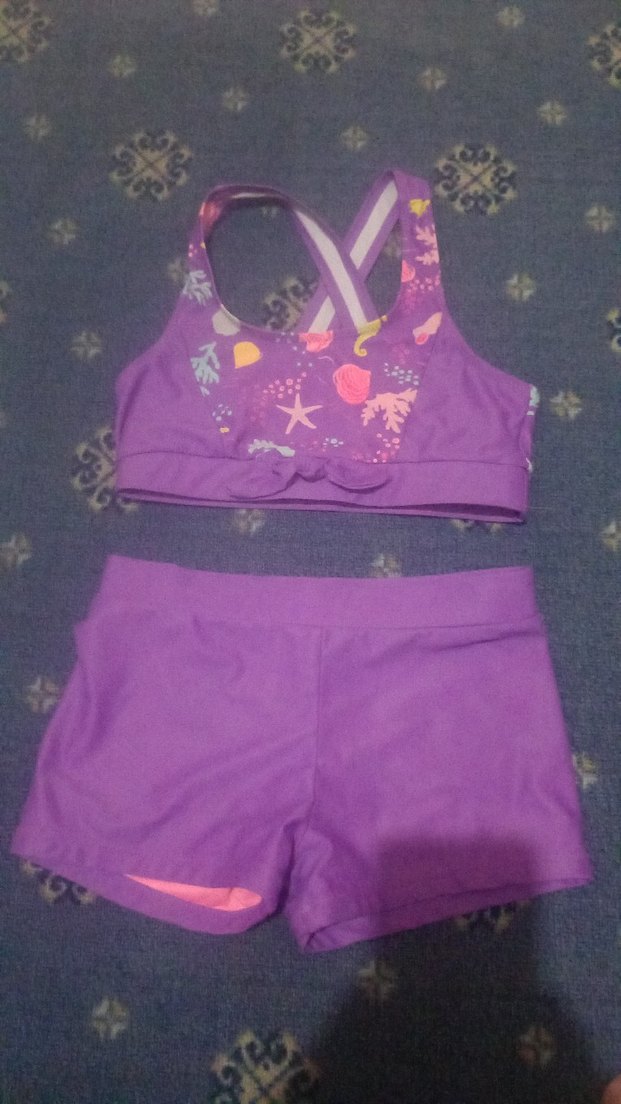 Kız çocuk mor renkli, desenli ve askılı üst ile uyumlu düz şortlardan oluşan bikini takımı, dış mekan kullanımı için uygundur.