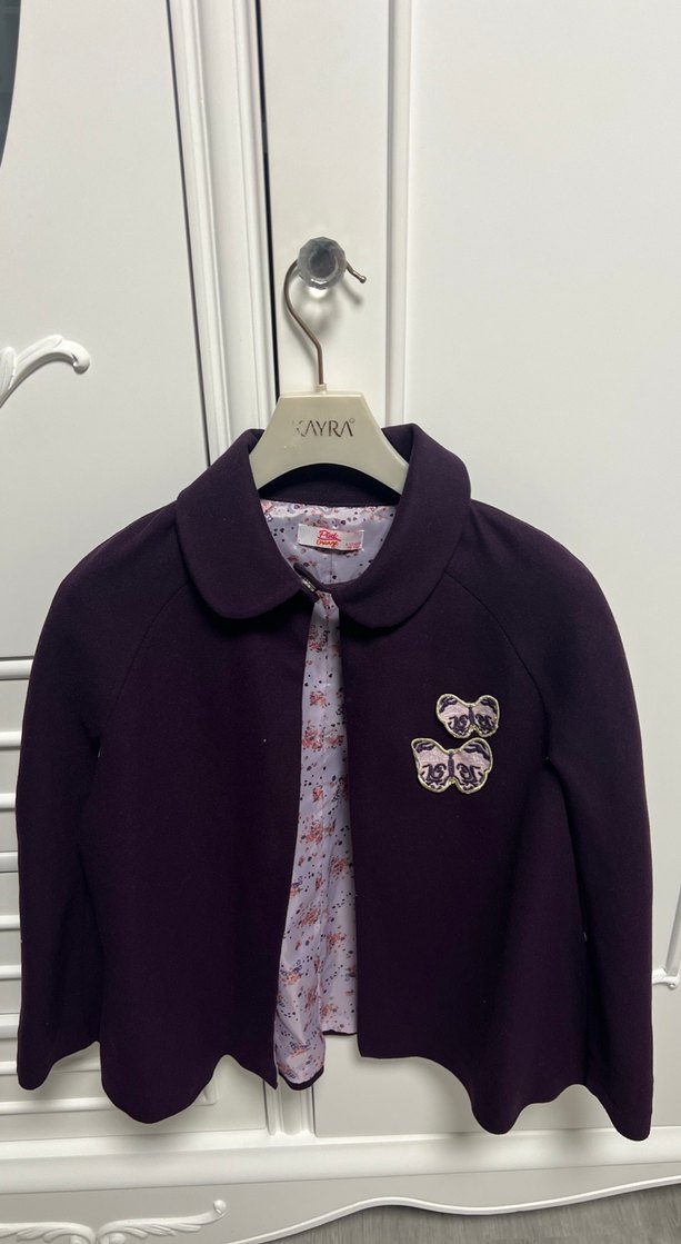 Kız çocuk mor bolero, uzun kollu ve yakası düğmeli. İç kısmı desenli olup, şık ve rahat bir sokak stili parçasıdır.