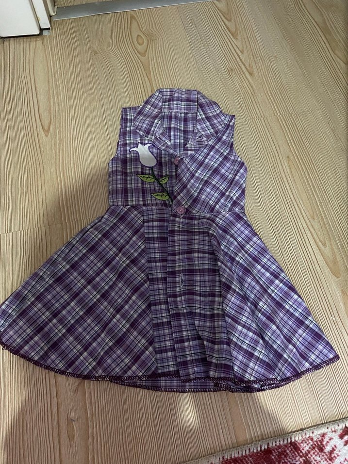 Mor renkli, kolsuz, düğmeli kız çocuk elbisesi. Notlu yaka ve renkli ekose desenli, sentetik kumaştan yapılmıştır. Rahat kesim ve çiçek detaylıdır. Hiç kullanılmadı