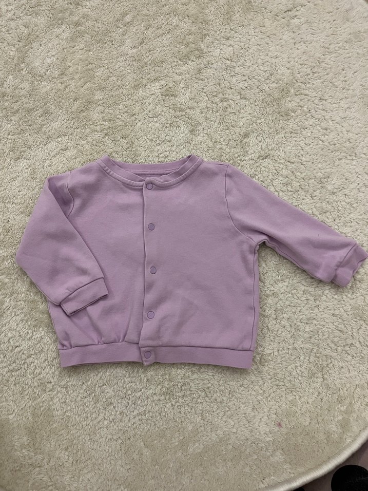 Pastel mor renkte kız çocuk hırkası, uzun kollu ve düğmeli. Yumuşak ve sıcak kumaştan, rahat ve sade tasarım.
