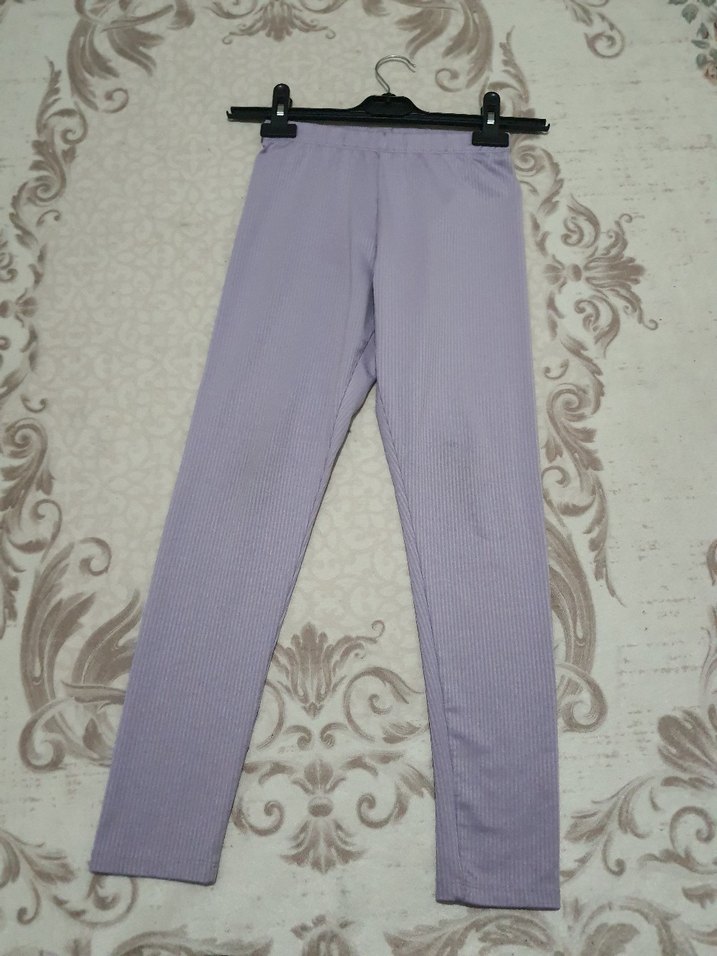 Kız çocuklar için elastik belli, yumuşak sentetik kumaştan yapılmış mor tayt. Rahat ve sokak stiline uygun pastel renkte.