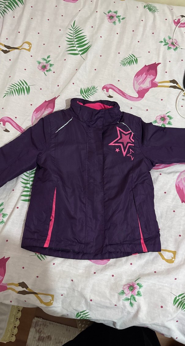 Kız çocukları için mor renkli, fermuarlı ve baskılı yıldız desenli, fitted kesim mont. Yumuşak ve sıcak kumaştan, straplez yaka ile sokak tarzı sunar.