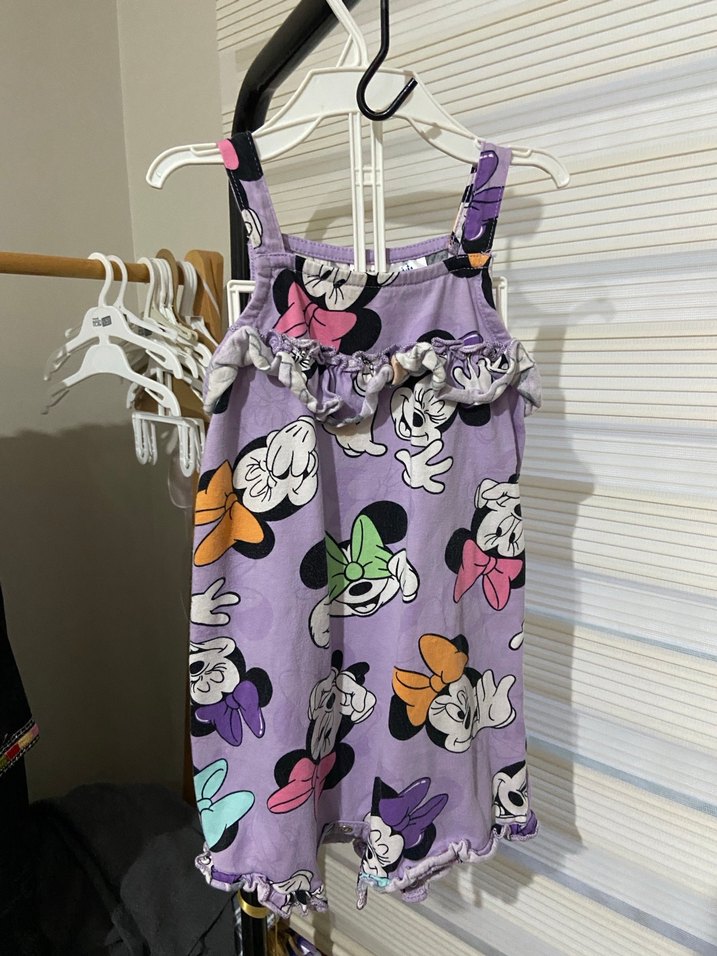 Mor askılı, bol kesim elbise, sentetik kumaştan. Renkli fiyonk desenli, fırfır detaylı, rahat ve trend sokak stili için uygun 12/18 ay tulum yazlık temi defosuz ve lekesizdir az giyilmiştir