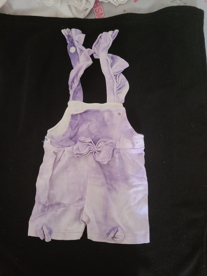 Yumuşak tekstil kumaştan, fırfırlı askılı ve fiyonk detaylı, pastel mor tonlarında bağcıklı kız çocuk tulumu. Street wear tarzında.
