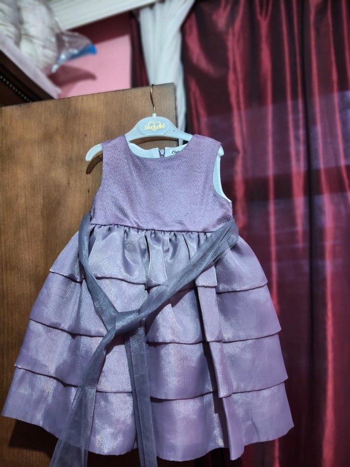 Mor renkli, fırfırlı katmanlara sahip, vücuda oturan kız çocuk elbisesi. Pürüzsüz sentetik kumaştan, askısız ve kolsuz tasarım.