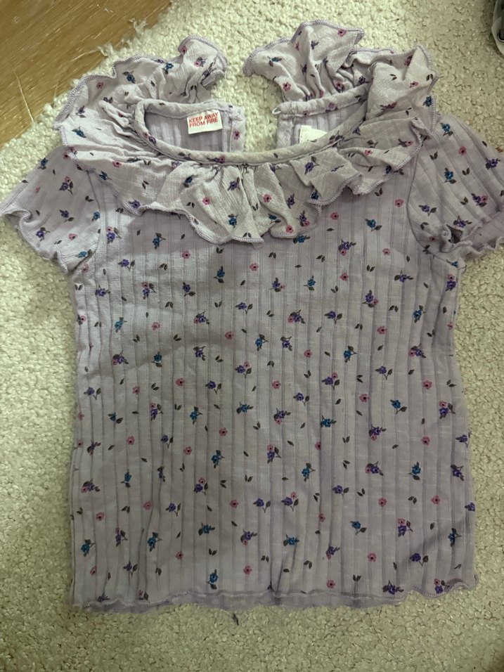 Kız çocuk için kısa kollu, bol kesim ve yumuşak keten kumaştan üretilmiş gömlek. Fırfırlı yakası ve pastel mor renkli küçük çiçek desenleriyle trend sokak stili için uygun.