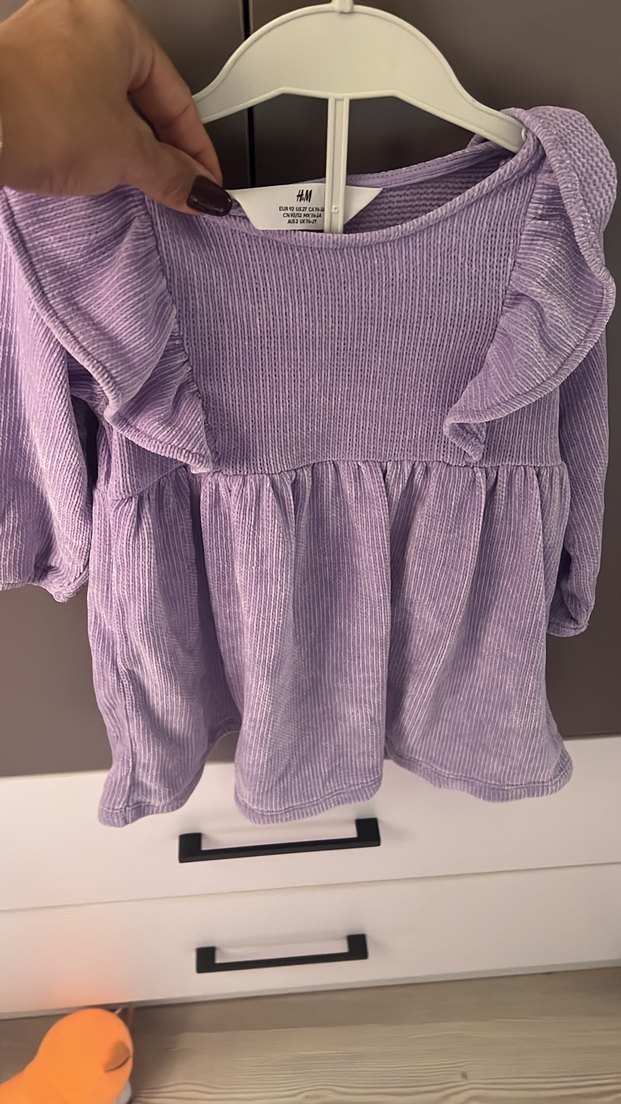 Yumuşak kadife kumaştan, mor pastel renkte, uzun kollu ve fırfır detaylı kız çocuk elbisesi. Salaş kesim ve yuvarlak yakalıdır.