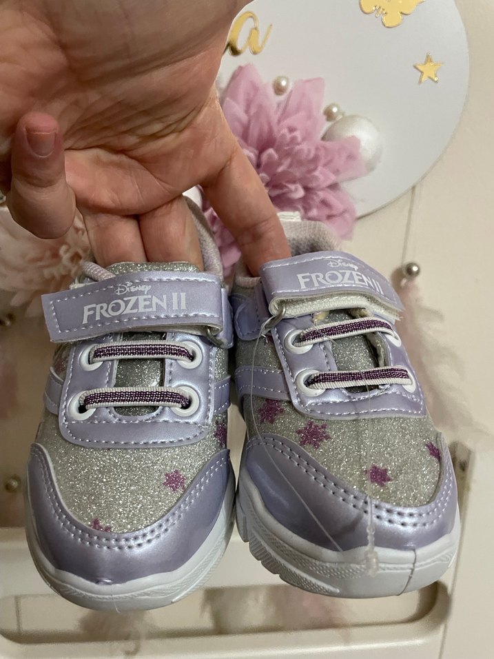 Mor pastel renkli, baskılı desenli ve cırt cırtlı kız çocuk spor ayakkabısıdır. Yumuşak kürk dokulu malzemeden üretilmiş, Frozen II yazılı bantlı ve sokak stilini yansıtır.
