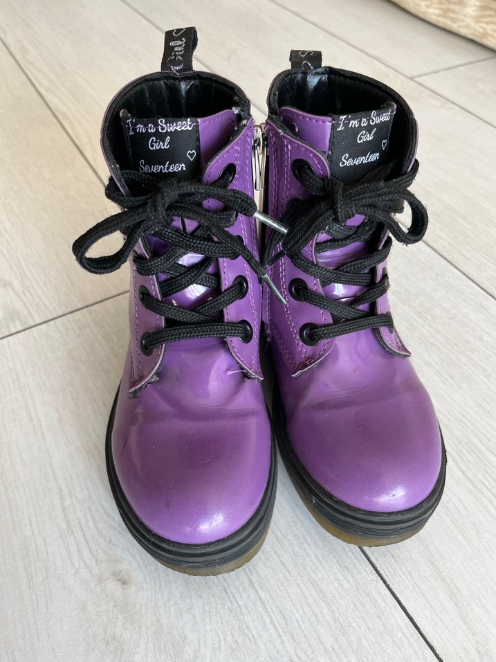 Koyu mor kauçuk, goth tarzı kız çocuk botları. Siyah bağcıklı, tokalı, yanlarda fermuarlı ve bağlamalı. Dil kısmında yazı detayı bulunur.