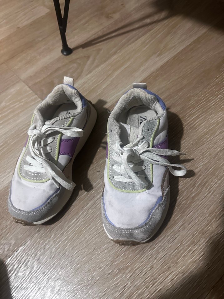 Mor ve gri tonlarında batik desenli, lastik tabanlı ve cırt cırtlı kız çocuk spor ayakkabısı. Sokak stili için uygun.