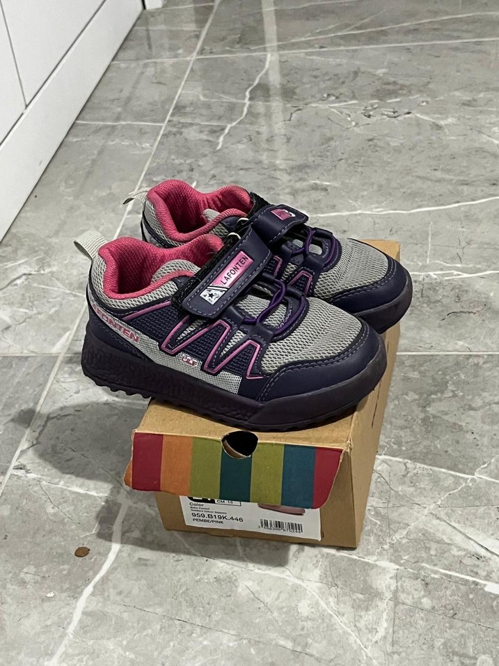Kız çocukları için mor ve gri renklerde, baskılı desenli, kauçuk tabanlı ve Velcro bantlı spor ayakkabılar.