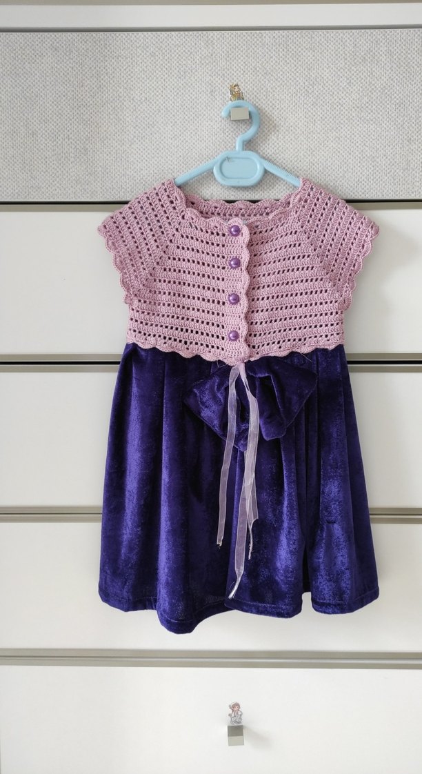 Kız çocuk için düğmeli, dantel detaylı pastel mor örme bolero ve büyük fiyonk süslemeli koyu mor kadife elbise.