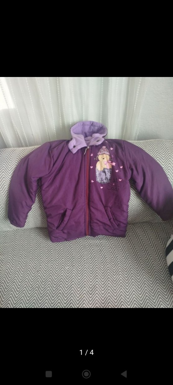 Kız çocuklar için mor fermuarlı kapüşonlu, baskılı ve yumuşak sıcak kumaştan yapılmış dar kesim ceket. Rahat sokak giyimi için uygundur.
