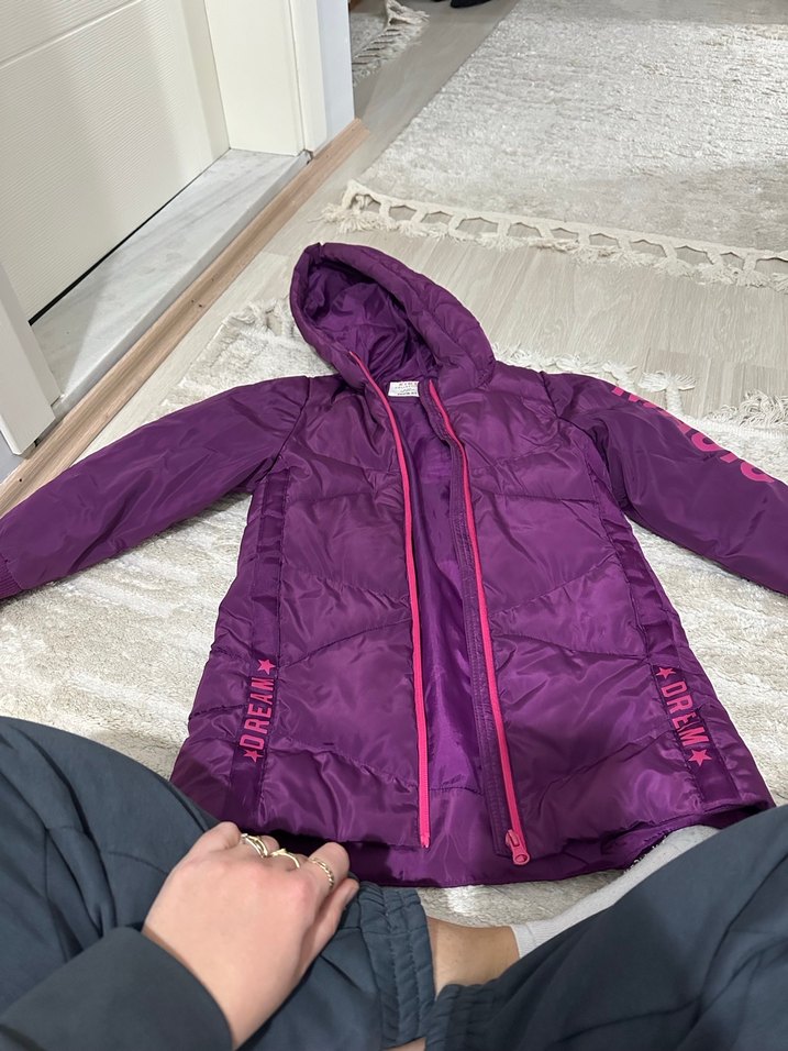 Parlak mor renkli, kapüşonlu ve fermuarlı kız çocuk montu. kızımın çok montu oldugundan çok az giyilmiştir
