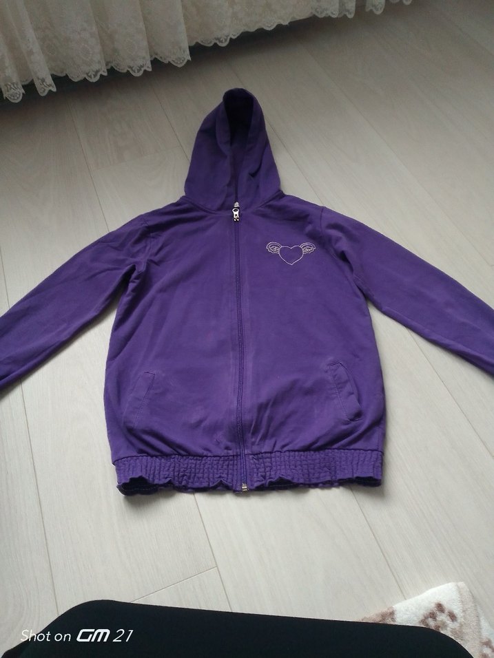 Mor renkli, kapüşonlu ve fermuarlı kız çocuk sweatshirtü. Uzun kollu, yumuşak ve sıcak kumaştan, parlak görünümlü, iki cepli ve kalp işlemeli sade model.