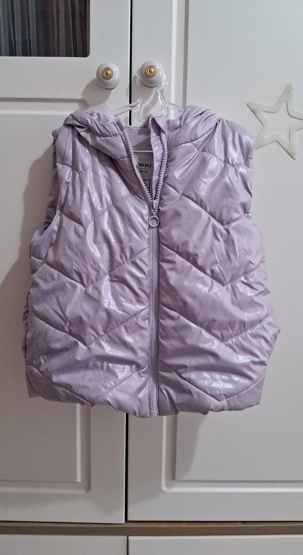 7-8 Yaş. Kız çocuklar için kapüşonlu, fermuarlı ve V yakalı, pastel mor renkte, rahat sentetik kumaştan üretilmiş, dar kesim yelek.