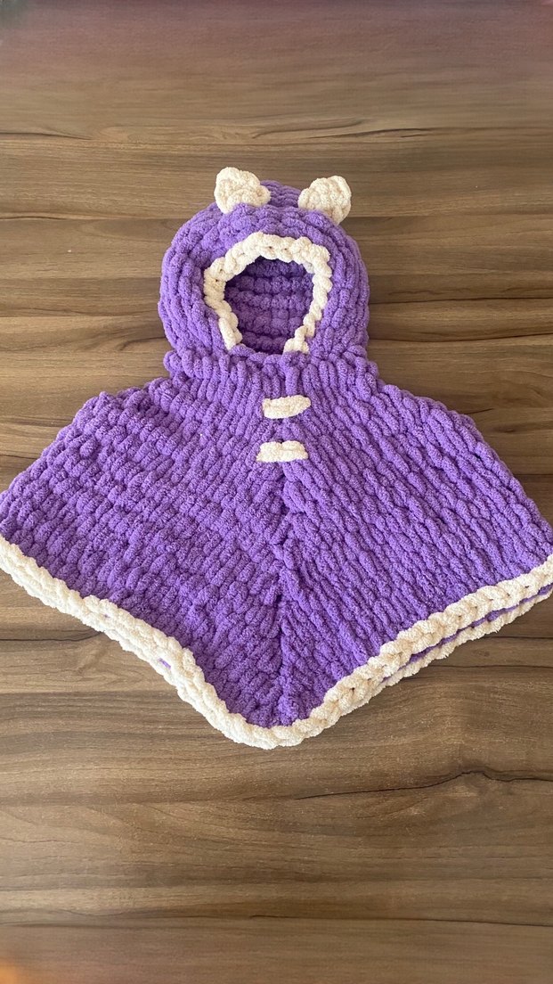 Kız çocuklar için mor pastel tonlarda, kapüşonlu ve kulak detaylı, yumuşak örgü kumaştan yapılmış bol kesim uzun kollu panço.
