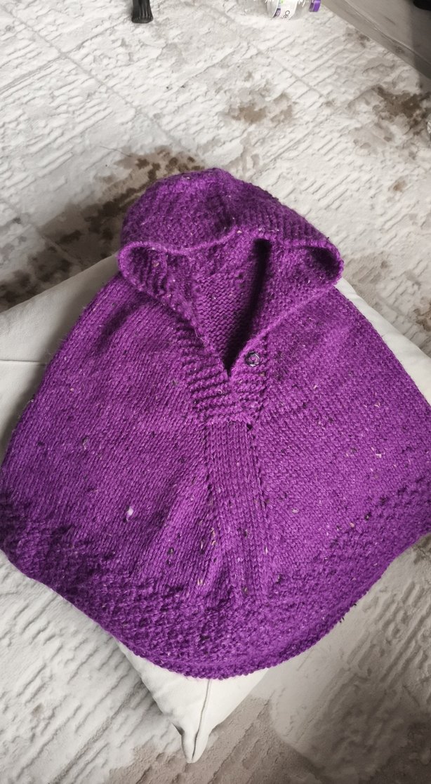 Parlak mor renkte, kapüşonlu ve uzun kollu örgü kız çocuk pançosu. Salaş kesim ve sade, bohem tarzı bulunur.