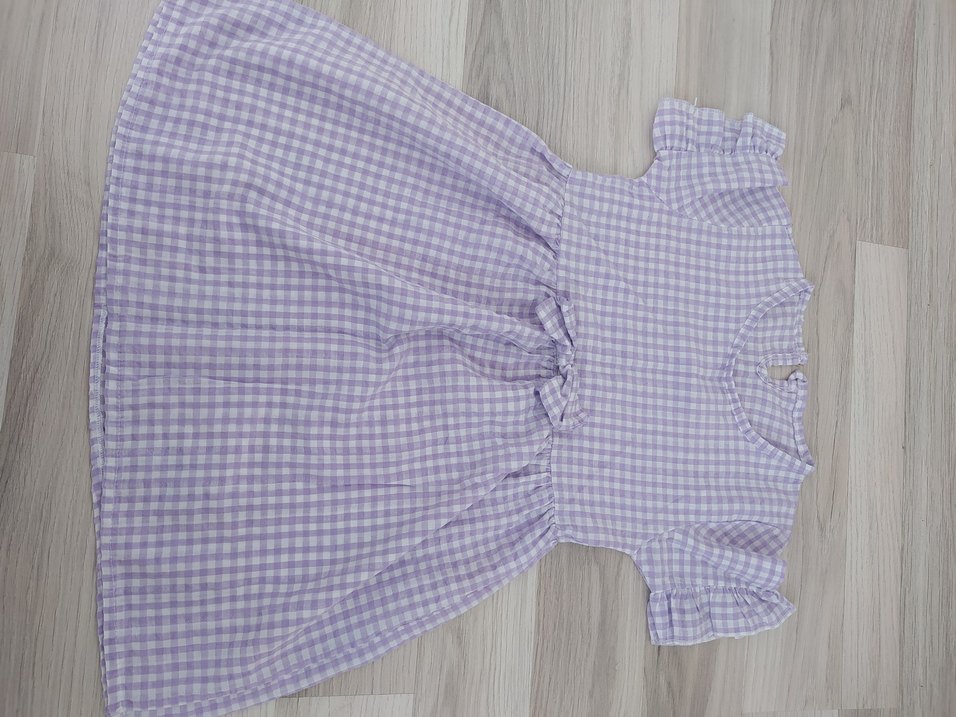 Kız çocuk mor kareli, kısa kollu ve V yakalı elbise, fırfır detaylıdır. Yumuşak sentetik kumaştan yapılmış, rahat kesimlidir. Sokak stiline uygundur.