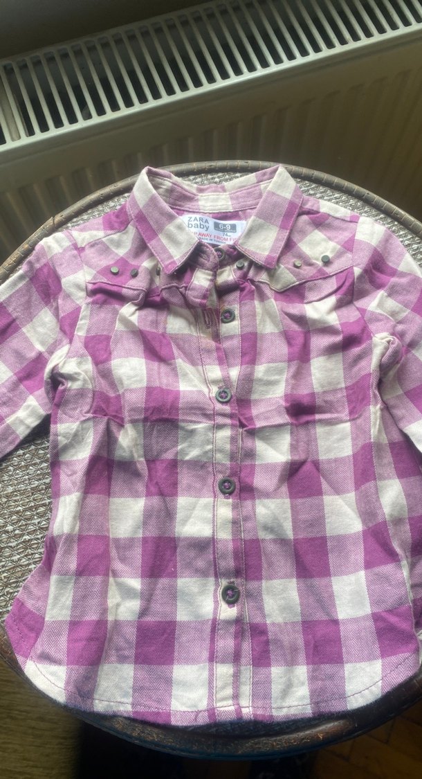 Kız çocuklar için düğmeli, uzun kollu, yakalı pamuklu gömlek. Gevşek kesim ve pastel mor kareli desenle rahat bir tarz sunar.