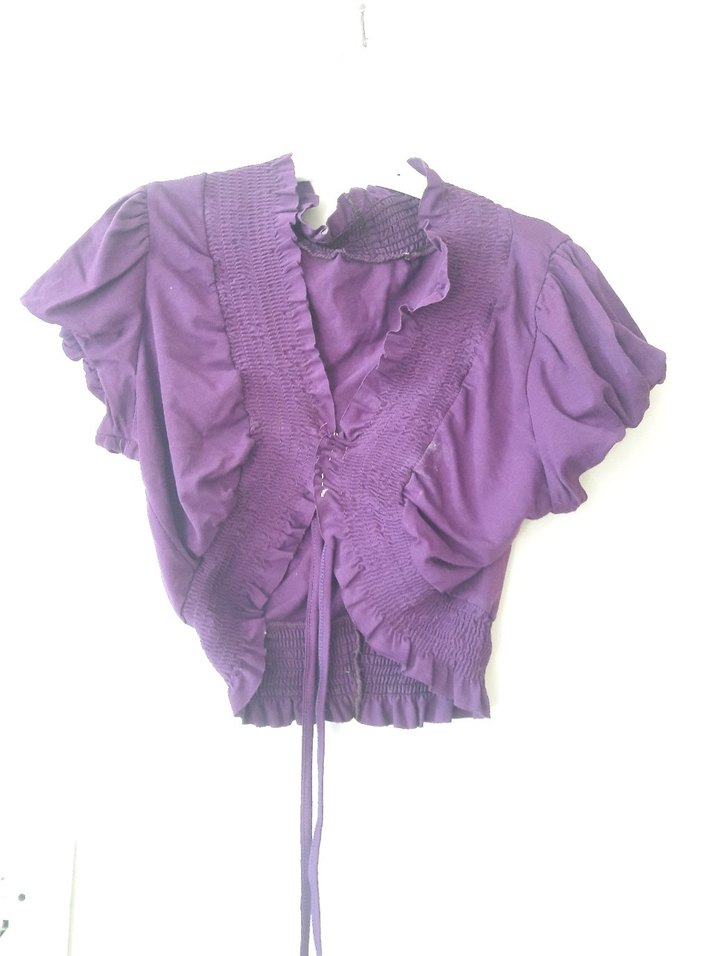 Keten kumaştan yapılmış, V yakalı ve kısa kollu, fırfır detaylı mor bolero, şık ve gotik tarzda tasarlanmıştır.