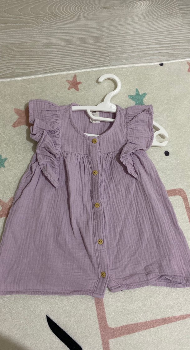 Keten kumaştan yapılmış, fırfırlı omuz detaylı, V yaka ve kolsuz mor gömlek.Rahat ve bohem tarzda, geniş kesim kız çocuk gömlek