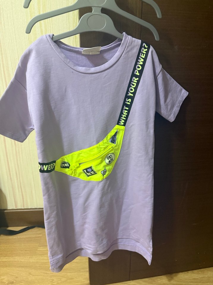 Mor kısa kollu, bisiklet yaka ve bol kesim kız çocuk elbise neon kemer baskılı sokak stili görünümü sunar.