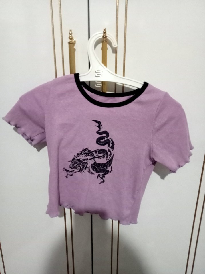 Fitted kesim kız çocuk tişörtü, kısa fırfırlı kollar, siyah detaylı bisiklet yaka ve pastel mor tekstil kumaş üzerine siyah baskılı ejderha deseni içerir.defosu yoktur sağlamdır iade de yoktur.aynı gün kargo