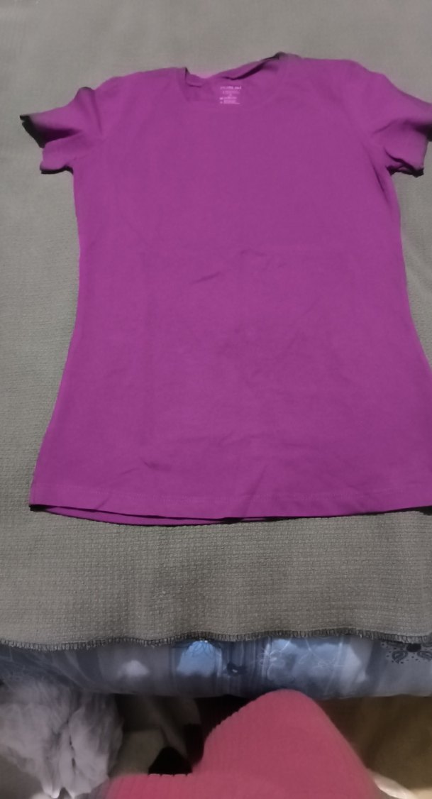 Koyu mor renkte, kısa kollu ve yuvarlak yakalı, sentetik kumaştan yapılmış, kız çocuklar için dar kesim tişört.