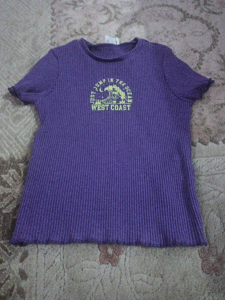 Mor renk, kısa kollu, yuvarlak yakalı, yün örme kumaştan yapılmış, baskılı West Coast desenli, kız çocuklar için dar kesim tişört.