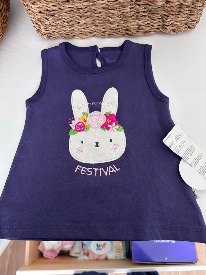 Mor renkte, kolsuz pamuklu, bol kesim kız çocuk tişörtü. Üzerinde çiçek detaylı tavşan baskısı ve FESTIVAL yazısı bulunur.