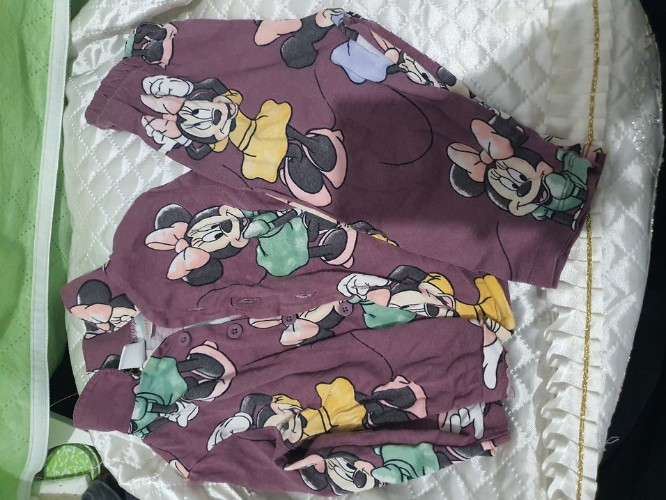 Kız çocukları için mor renkte, renkli Minnie Mouse baskılı pijama. Uzun kollu, V yakalı ve düğmeli, yumuşak sentetik kumaştan yapılmıştır.