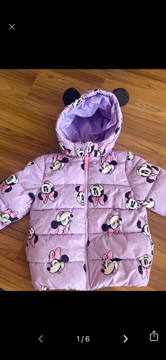 Mor renkli, Minnie Mouse baskılı, kapüşonlu ve düğmeli kız çocuk montudur. Sokak stili için uygun, yumuşak ve sıcak tutar.