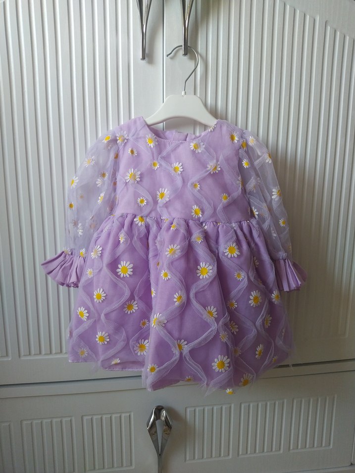 Mor uzun kollu kız çocuk elbisesi, nakışlı papatya desenleri ve fırfır detaylarına sahip. Bol kesim ve yuvarlak yakalı, 1 kere doğum gününde fotoğraf çekiminde kullanıldı hiç bir kusuru yoktur