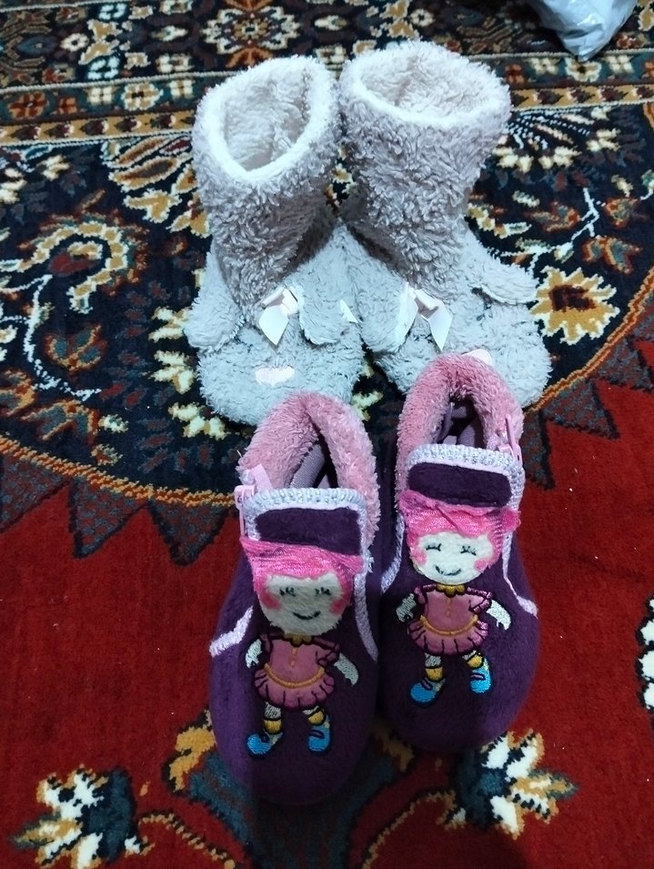 Mor renkte, nakışlı renkli desenlere sahip, kız çocukları için örgü sıcacık terlikler.23 vb e 25 no