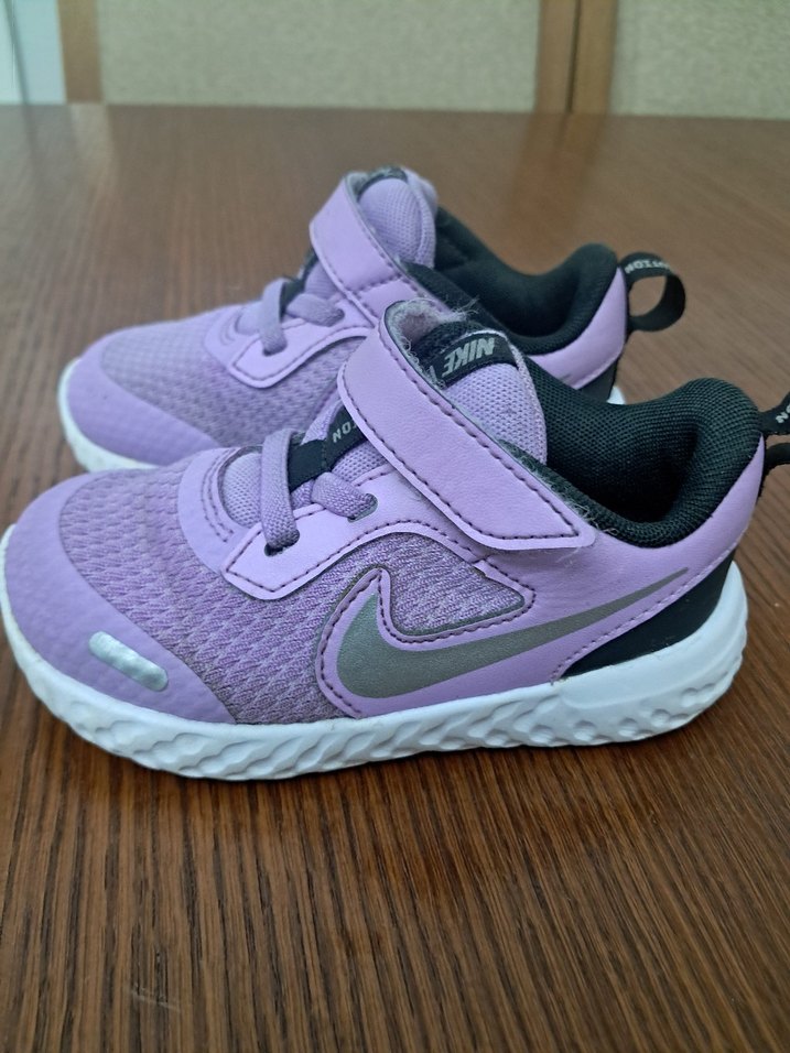 Mor renkli, bağcıklı ve cırt cırtlı Nike kız çocuk spor ayakkabısı, rahat kauçuk tabanlı, sokak modasına uygun.