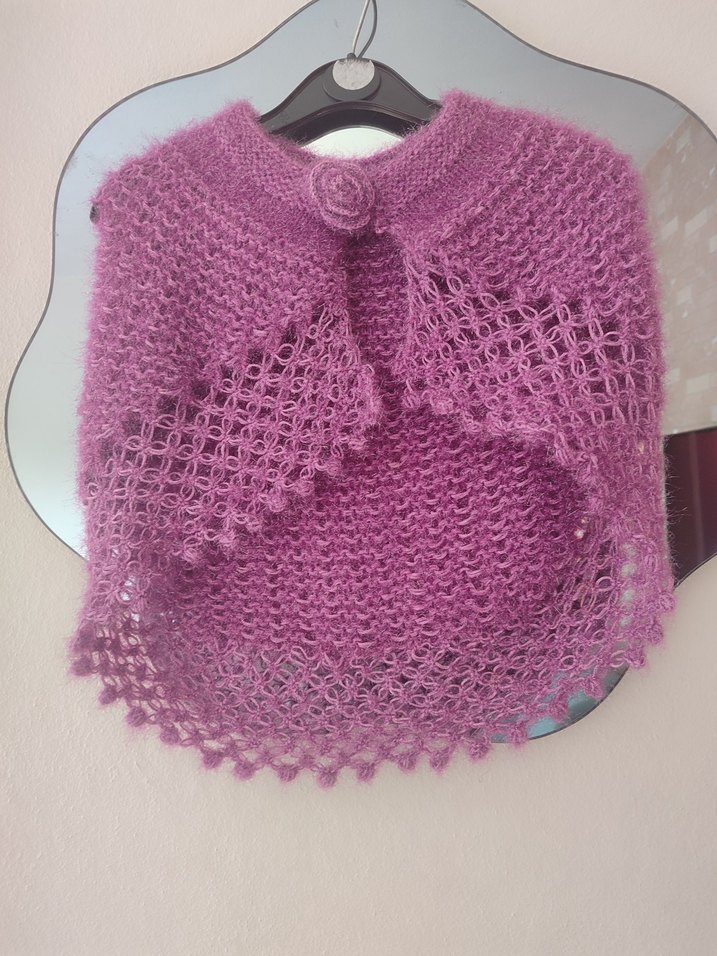 Kız çocuklar için pastel mor renkte, bohem tarzda, örgü dokulu, bol kesim ve kayık yaka panço. elle örülmüştür el emeği sıfor ürün