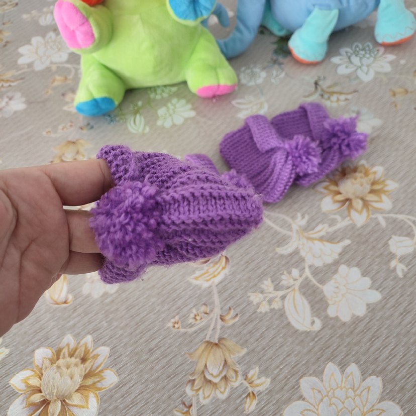 Yumuşak örgüden yapılmış, ponpon detaylı mor kız çocuk botları. Bohem tarzda, rahat ve renkli. adet fiyati